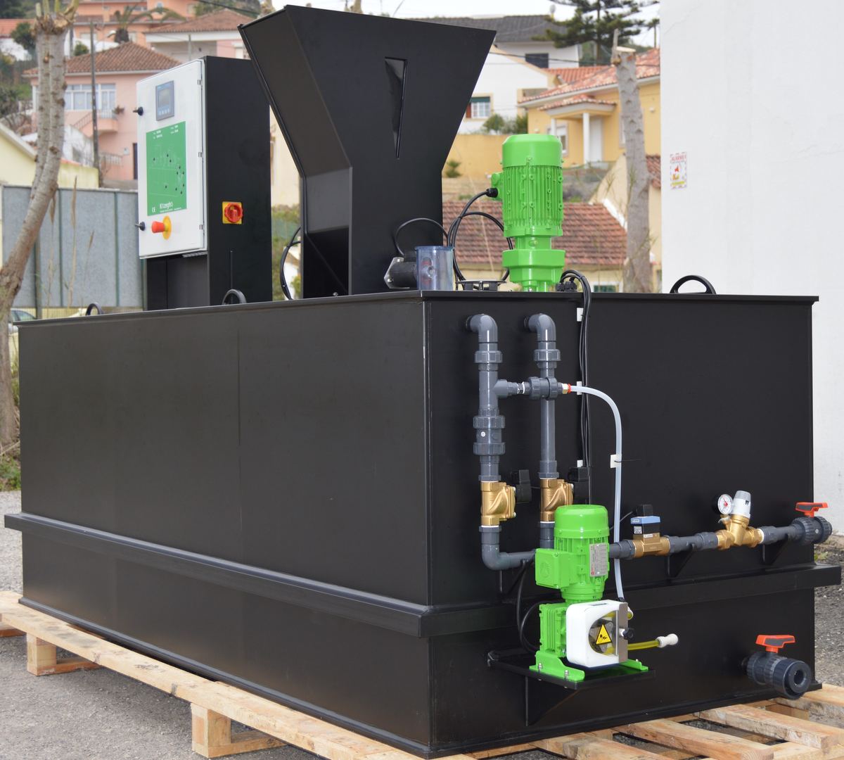 La capacité de ces unités dépend du temps de dissolution nécessaire au floculant utilisé. D’une manière générale les temps de dissolution recommandés par les fabricants sont de 60 mn. Les unités se présentent sous forme de cuve parallélipedique construite en PEHD et disposant de 3 compartiments de mise en solution, de maturation et de dosage, communicant entre eux par débordement Le cycle de fonctionnement est controllé par une sonde de niveau à ultrasons installé à la verticale du compartiment de dosage, qui commande automatiquement le cycle de préparation dès que le niveau bas préenregistré est atteint. A la suite de l’ouverture de l’électrovanne, le débit instantanée d’eau est mesuré et le débit de poudre ou d’émulsion injecté est en permanence ajusté à ce débit instantané d’eau pour garantir une concentration de préparation égale à celle qui à été programmée, malgré les éventuelles variations du débit d’eau.